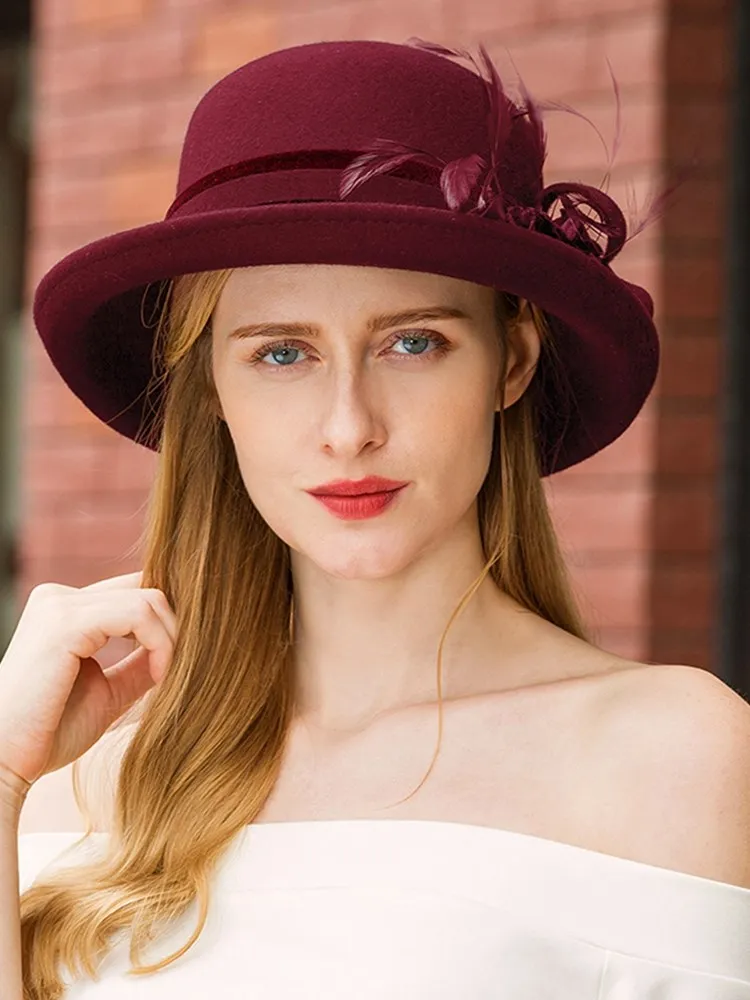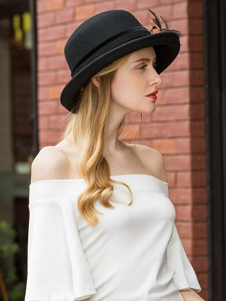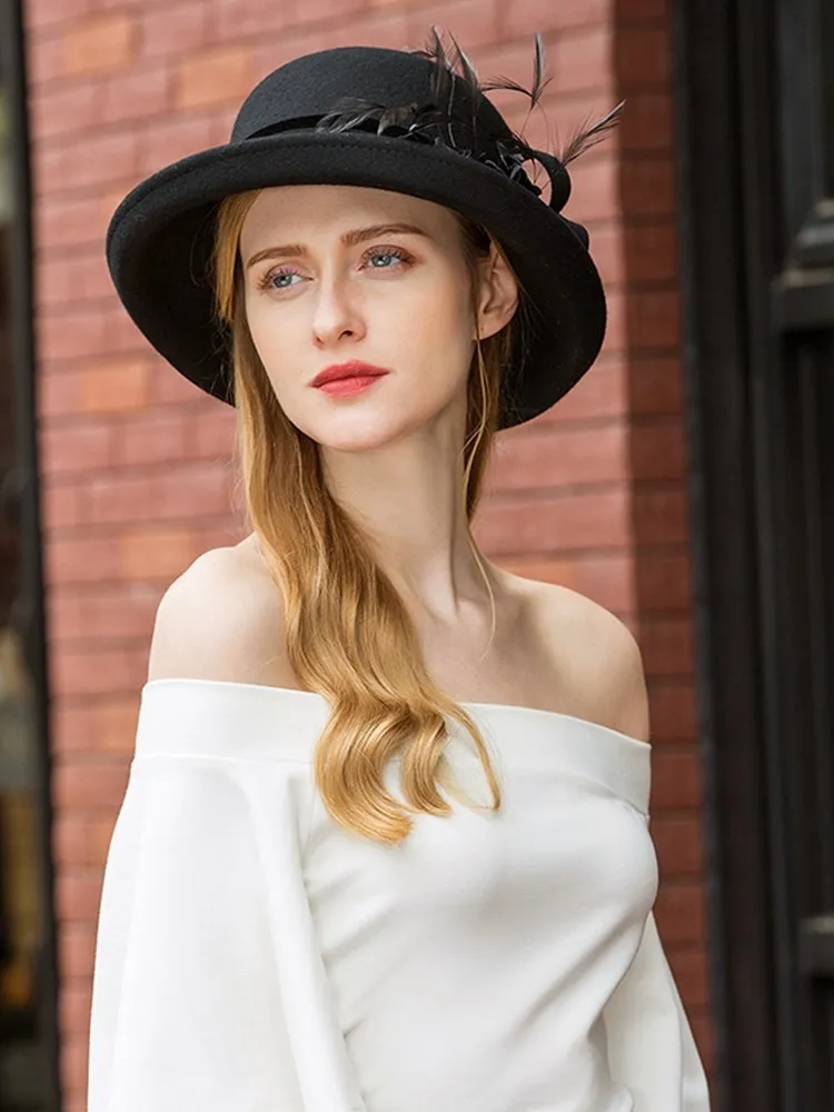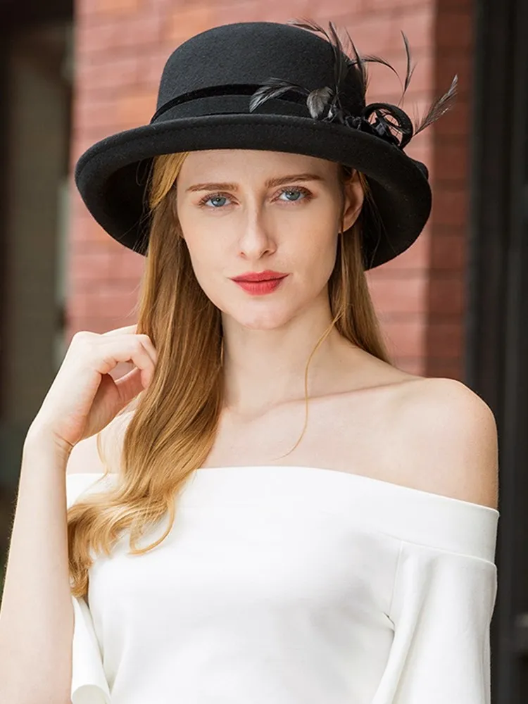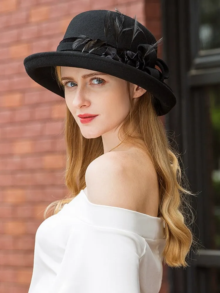EE 5015 Autumn/Winter wool feather hat everything with winter elegant black curled-brimmed hat female autumn
