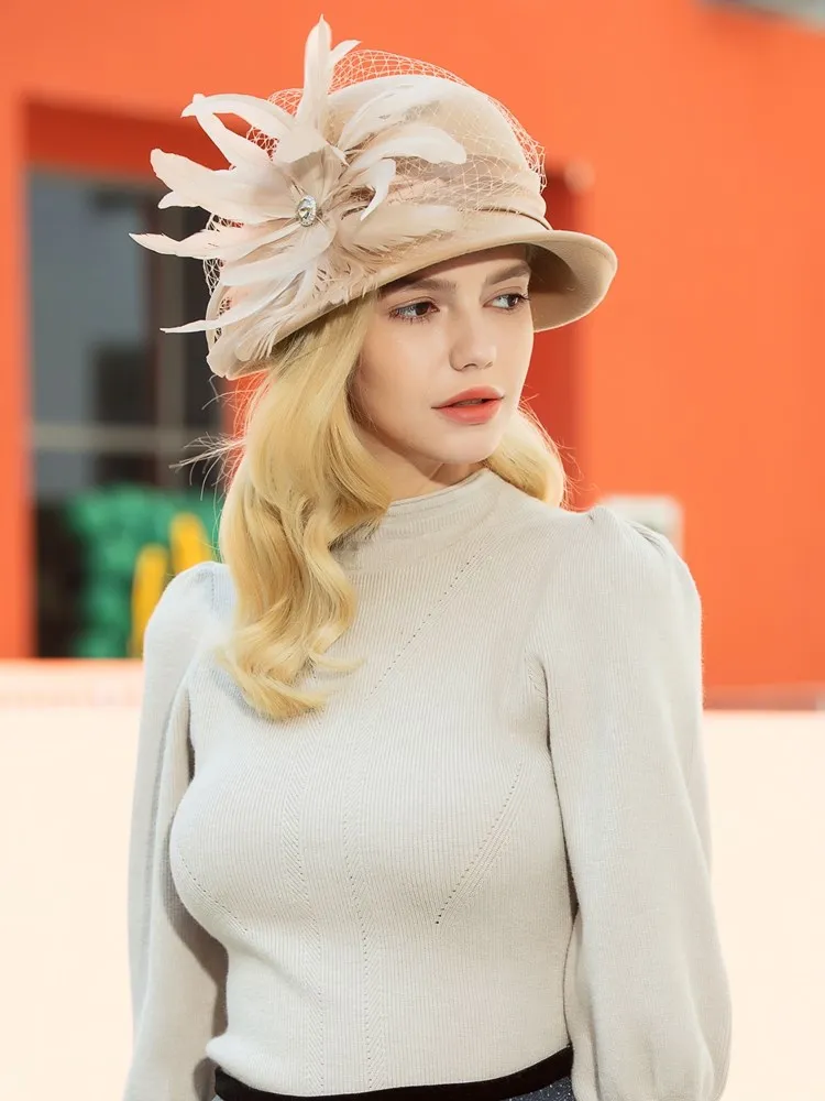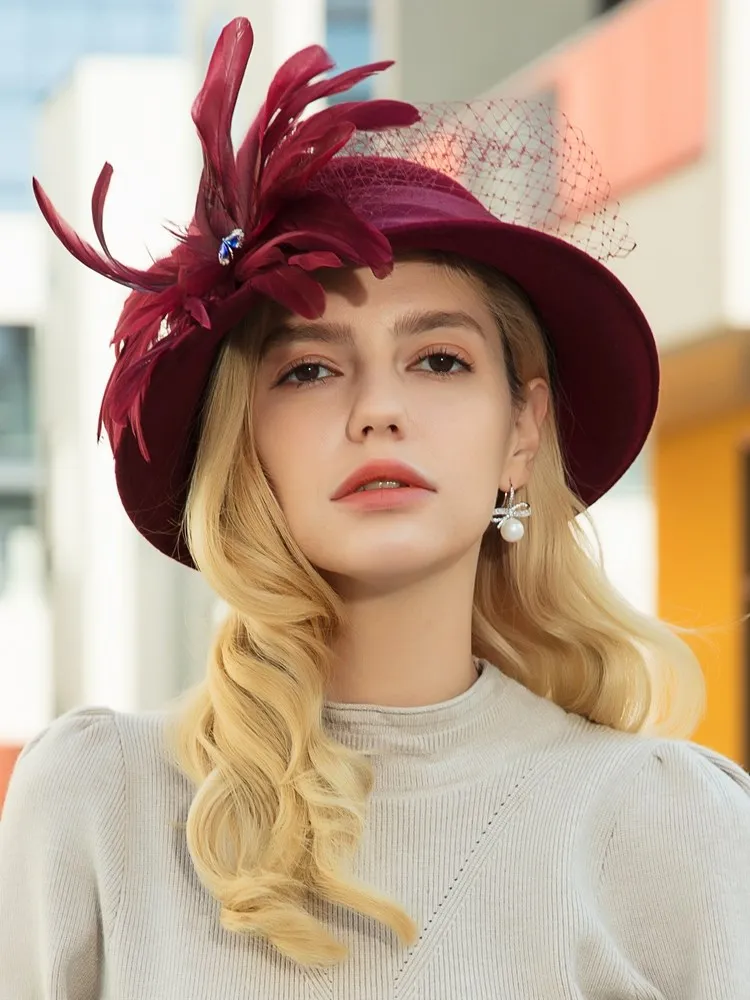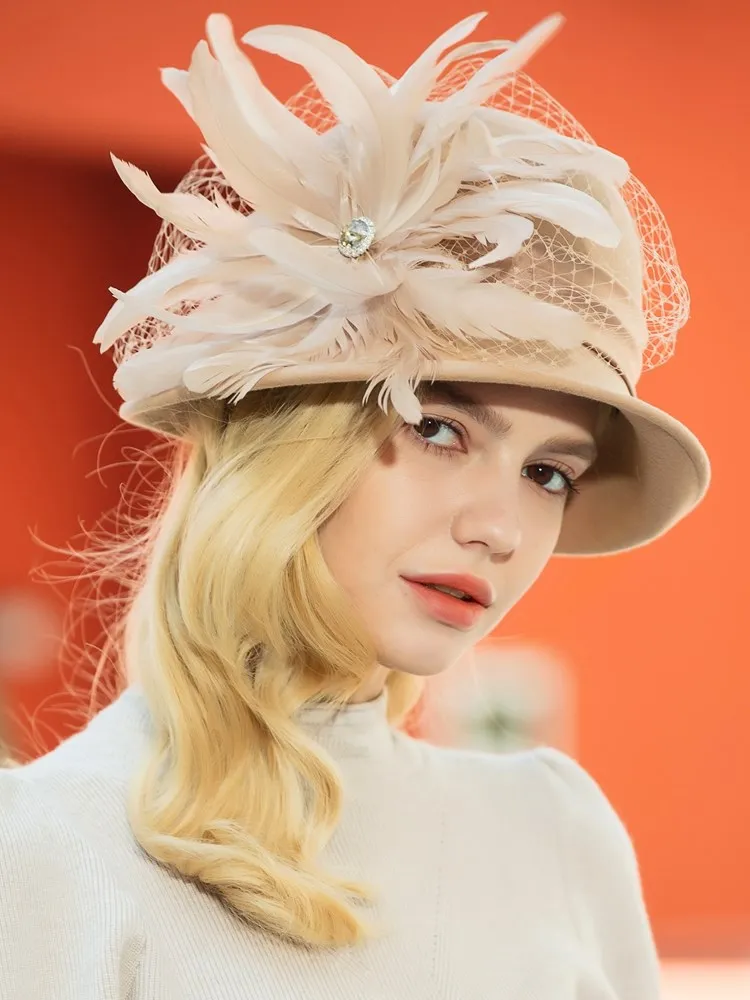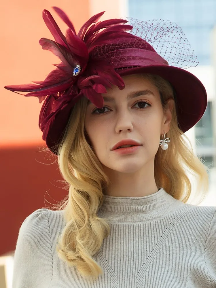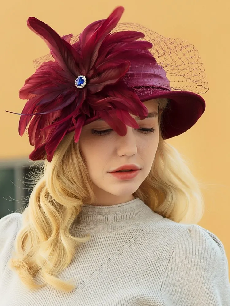 EE 5164 Autumn/Winter wool top Hat Feather rhinestone dome warm woolen hat for women