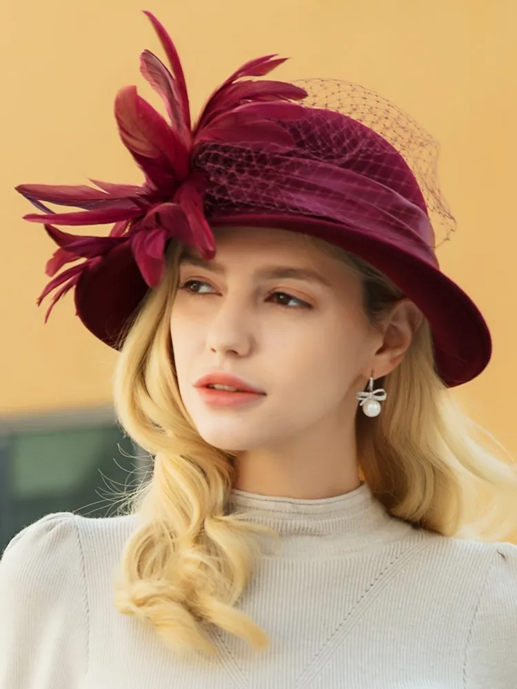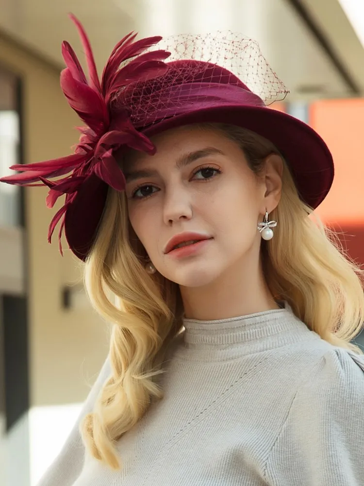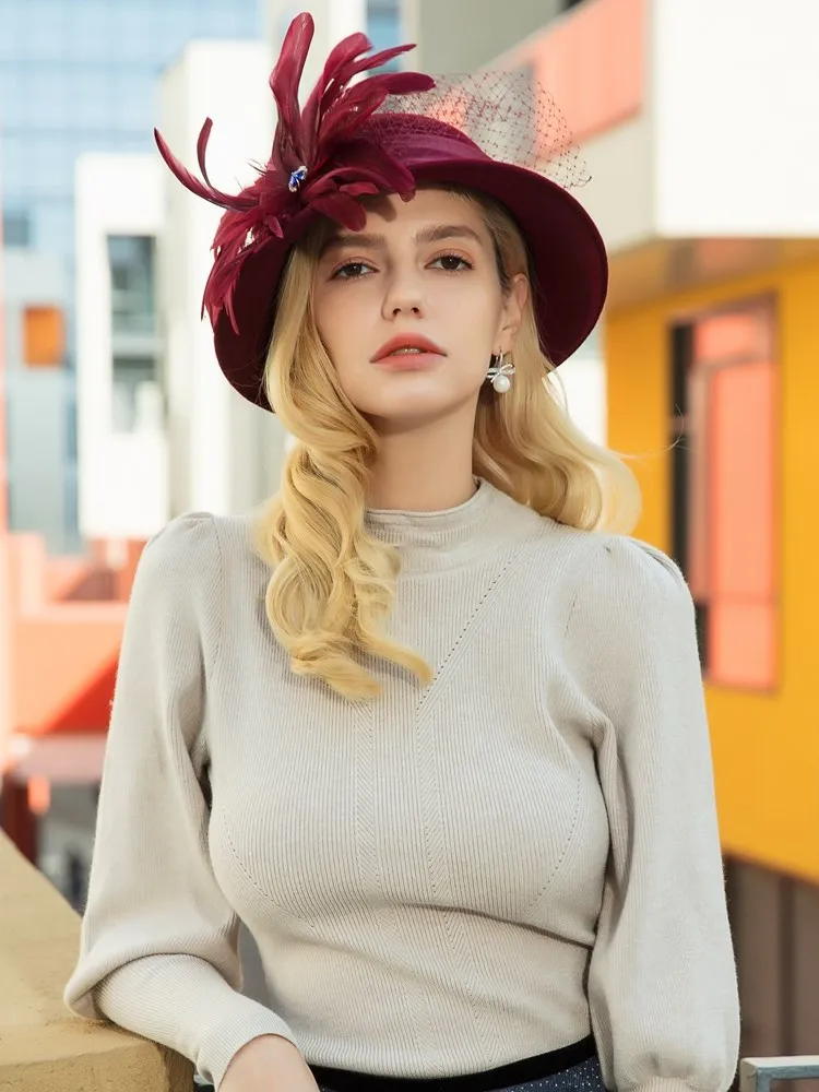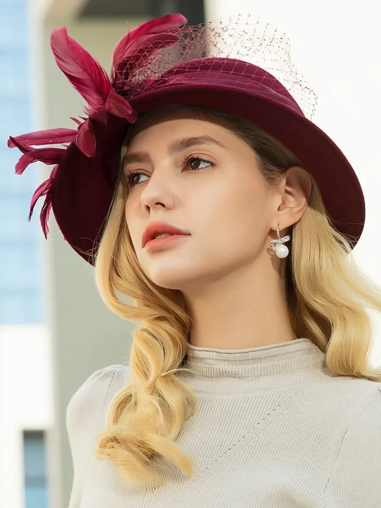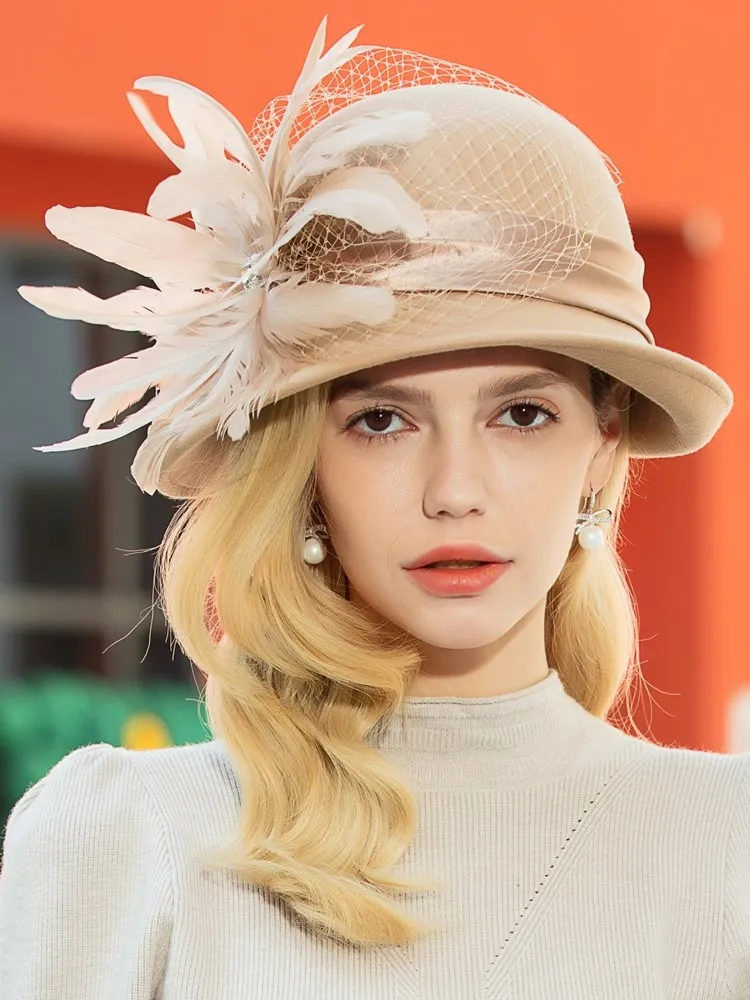 EE 5164 Autumn/Winter wool top Hat Feather rhinestone dome warm woolen hat for women